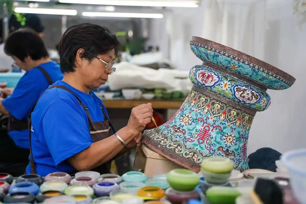 其中“点蓝”指的是给掐好丝的金属胎体填上各种颜色的釉料,也就是“上色”的过程。