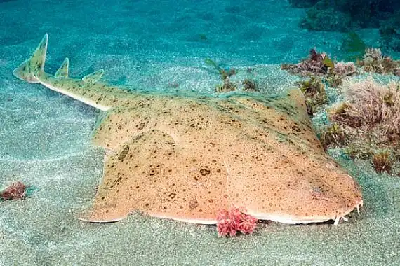 “扁鲨”这个名字,基本就说明了它的外形特点:身体超扁、四肢宽展,整条鱼像被压扁的毯子。