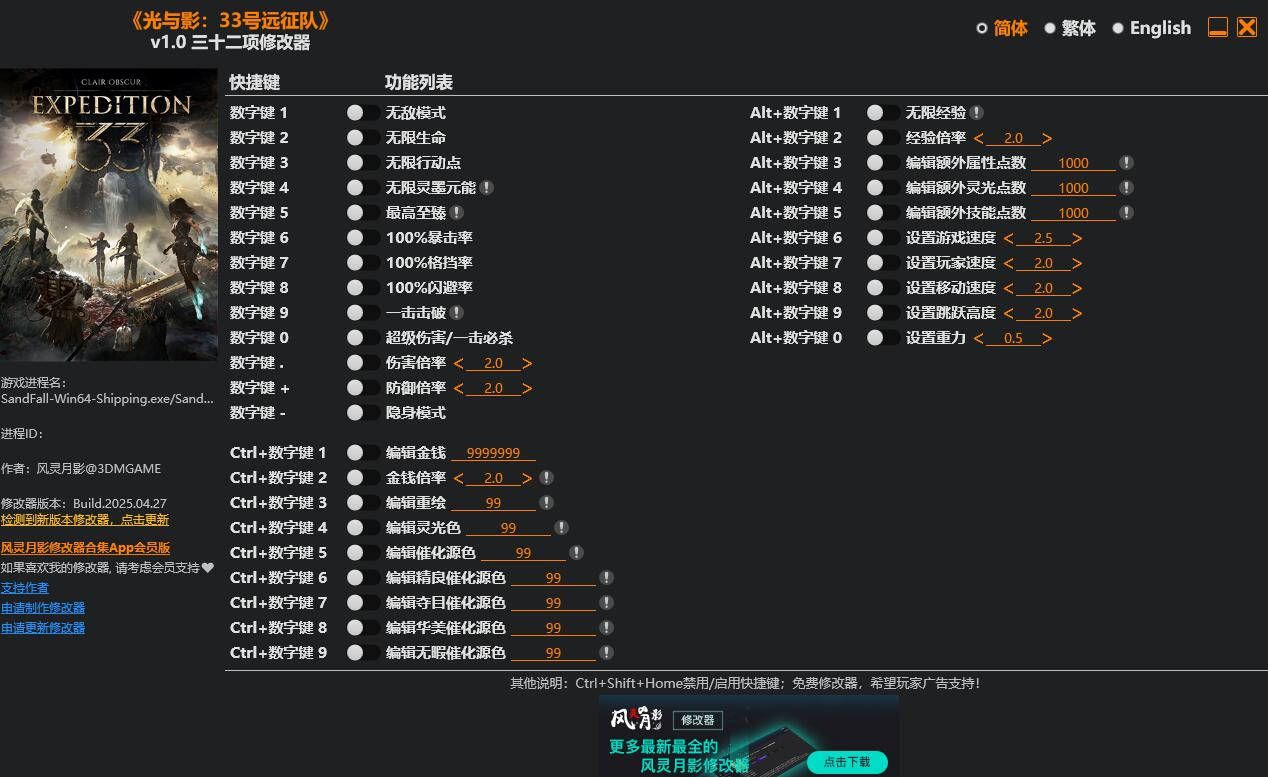 在光与影33号远征队中,风灵月影能帮助玩家轻松更改游戏中的各类数值,提升游戏体验。无论你是想要试试极限的战斗力,还是调整游戏的其他参数,这款软件都能让你轻松实现。那么,如何使用光与影33号远征队三十三项风灵月影呢?让我们一步步来看看吧!