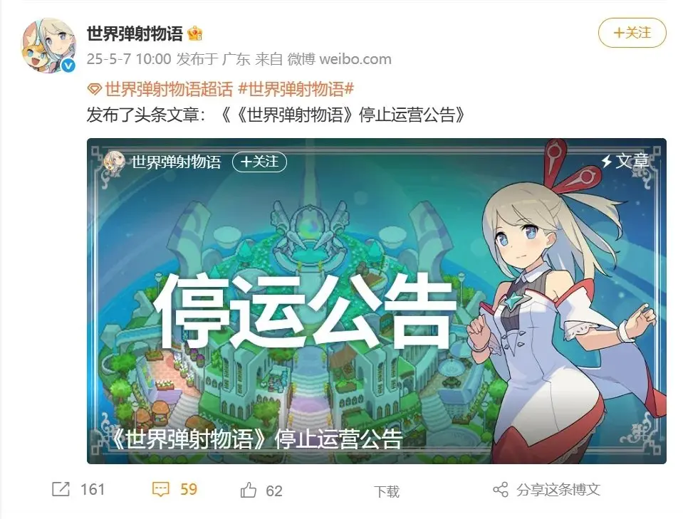 昨日(2025年5月7日),《世界弹射物语》国服正式发布停运公告,宣布这款深受玩家喜爱的二次元弹射RPG游戏将于2025年8月14日18:00正式停止运营。