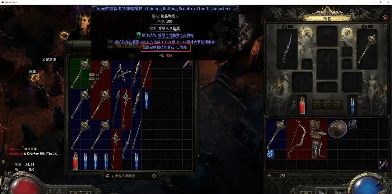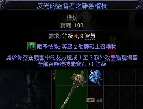 2、这把权杖的关键属性是全部召唤物技能宝石+1,对于召唤流派非常重要。