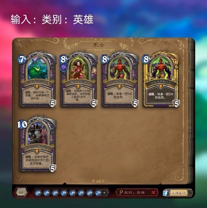 1、类别:英雄 ➜ 查找英雄牌,例如死亡骑士的“巫妖王”或战士的“迦拉克隆”。