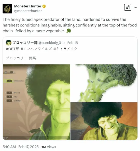 有趣的是,连卡普空官方都忍不住转发并评论:“这片土地上最顶级的捕食者,在极端环境下顽强生存,自信地站在食物链顶端……结果被一棵蔬菜砍倒了。”