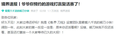 《境·界 刀鸣》始解测试现已定档3月13日!测试资格招募也在如火如荼进行中,大家别忘记前往《境·界 刀鸣》官网或者扫描图中二维码进行始解测试报名。3月13日,让我们在游戏里一起喊出:“卍解!”