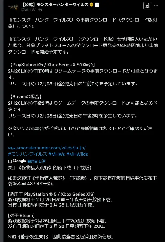 距离《怪物猎人:荒野》正式发售仅剩不多时间,想要第一时间进入游戏的猎人们,记得提前预载,准时踏上全新的狩猎征程!