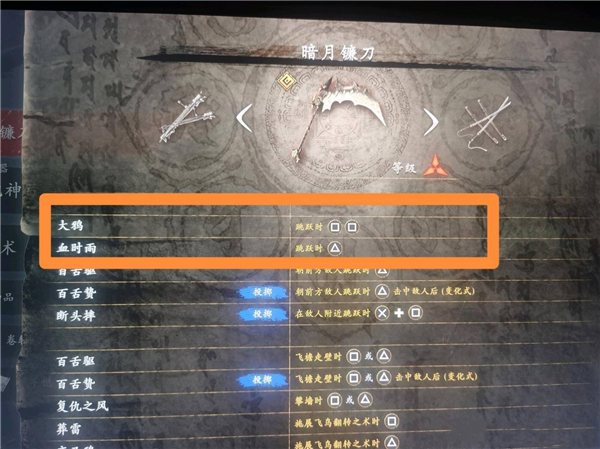四、暗月大镰刀 - 大鸦 + 及时雨按键:风驱跳起,按两次口,再按一次△。