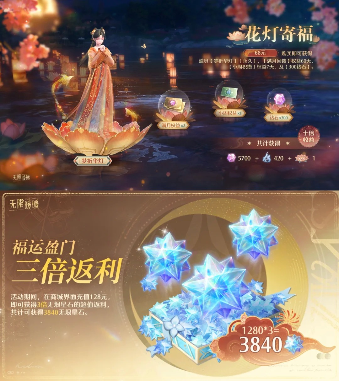 奖励:道具【梦祈华灯】(永久) + 月卡60天 + 周卡7天 + 300钻石