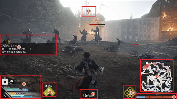 1、血量、斗气和无双量表:屏幕左下角显示的是你角色的血量(绿色)、斗气(黄色)和无双量(深蓝色)。在血条上方,你还能看到队友们的血量和无双量。