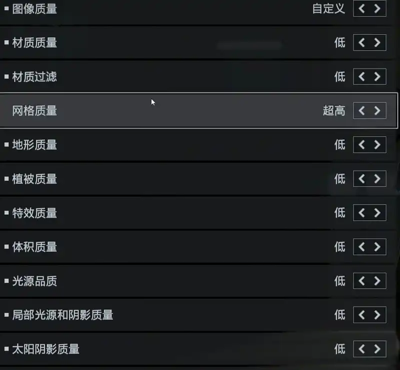1、画质全低+网格质量稍高 = 画面清晰+帧数更稳