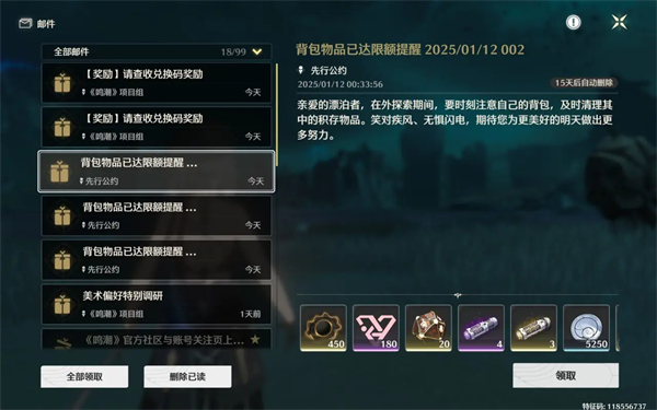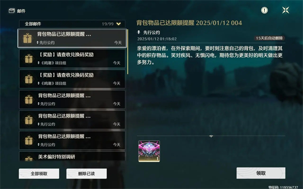 2、这也意味着,如果背包满了,你仍然能够通过邮件领取声骸材料,其他物品则不会受到影响。