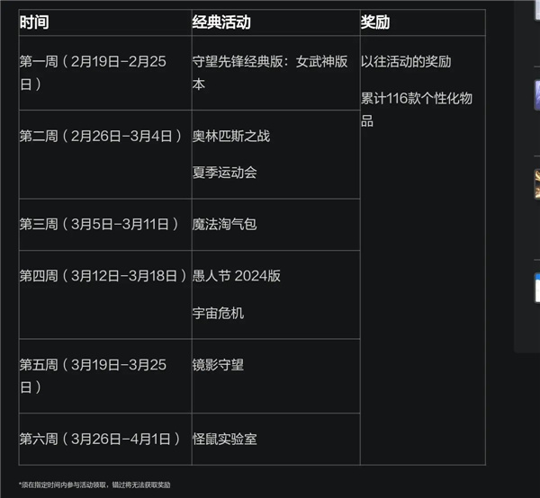 每周登录并参与经典活动,即可解锁116款返场奖励,包括经典皮肤、饰品等。
