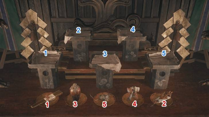把五件贡品(鼠、鱼、和服、花瓶、纸扇)按正确顺序摆到五个底座上。