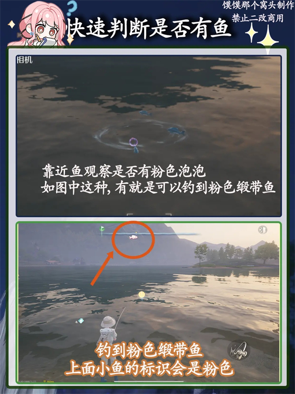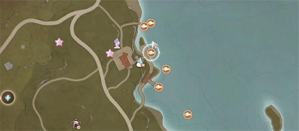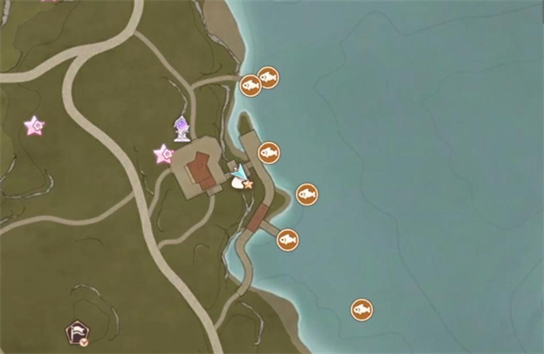 >每个钓鱼点附近都会有明显的粉色泡泡提示,靠近这些地方就能看到它们。
