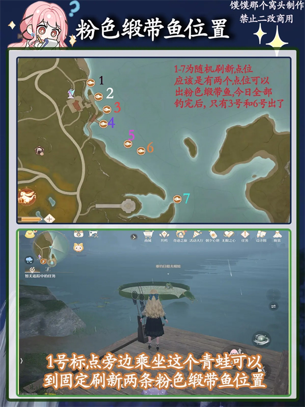 2、6个固定点位:这些点位是每天都会刷新,并且大多数情况下能钓到粉色缎带鱼。你可以通过下图中标记的点位来确认具体位置。