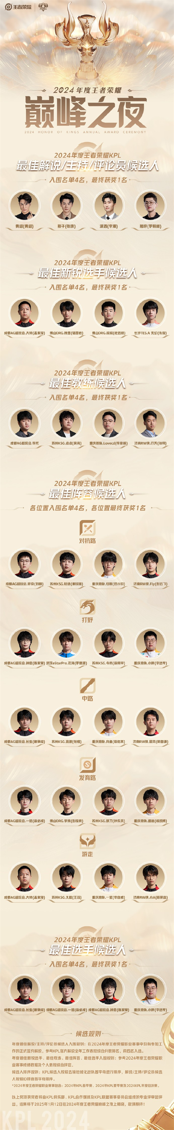 奖项将依据2024年KPL春季赛、夏季赛及年度总决赛的成绩和选手表现进行综合评定。