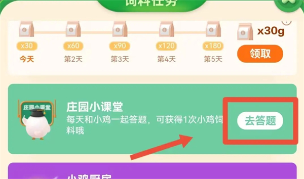 3、进入【蚂蚁庄园小课堂】,点击【去答题】按钮;
