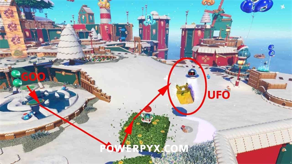 利用能力创造浮空平台并飞到空中的礼物旁,将飞碟打落即可获取。