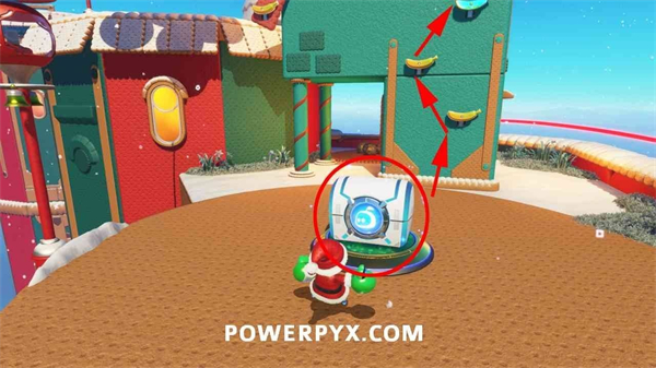在大圣诞树旁使用气球能力飞到马卡龙平台。
