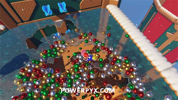 使用海绵吸水后,利用变球能力穿越火山和跳台,到达房屋顶端,进入烟囱并找到金色礼物。