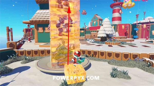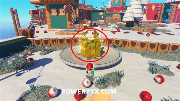 从姜饼区域返回,在灯塔附近的蓝色平台上使用小鸡跳跃能力跳到灯塔顶端,获取礼物。