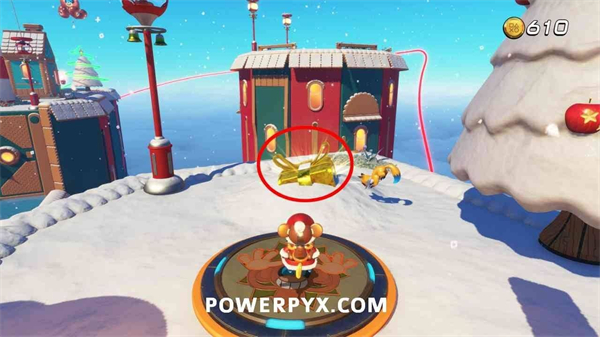 跳到风车旁的平台上,使用猴子能力爬上屋顶并从雪堆中拉出礼物。
