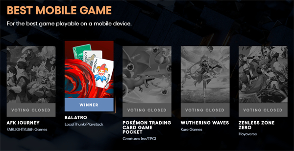在“最佳移动游戏”提名中,绝区零与AFK Journey、小丑牌、鸣潮、宝可梦TCGP一同入围,最终由小丑牌成功摘得桂冠。