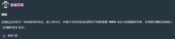 阿格莱雅召唤衣匠并发动联合攻击,造成全体敌人雷属性伤害,并有机会使敌人陷入“间隙织线”状态。