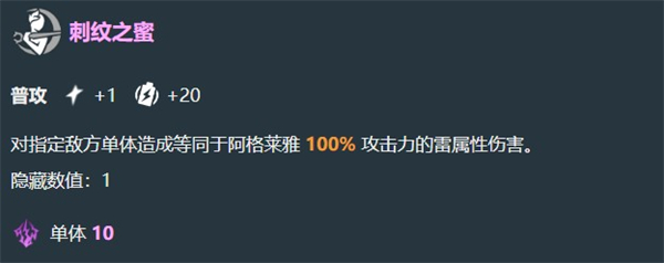 阿格莱雅的普攻可以对敌人造成相当于50%-100%攻击力的雷属性伤害。