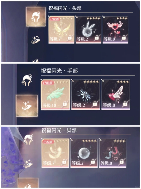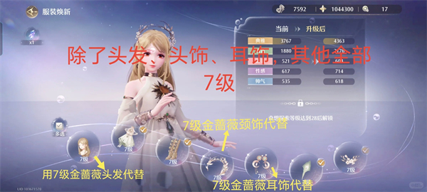 2、金蔷薇套装:头发、耳饰、颈饰优先升级到7级,可替换净化套相应部件。