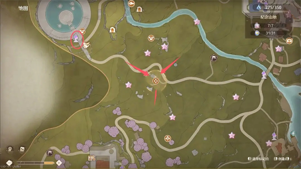 1、打开地图,使用流转之柱传送至古花愿镇纪念公园雕像旁。