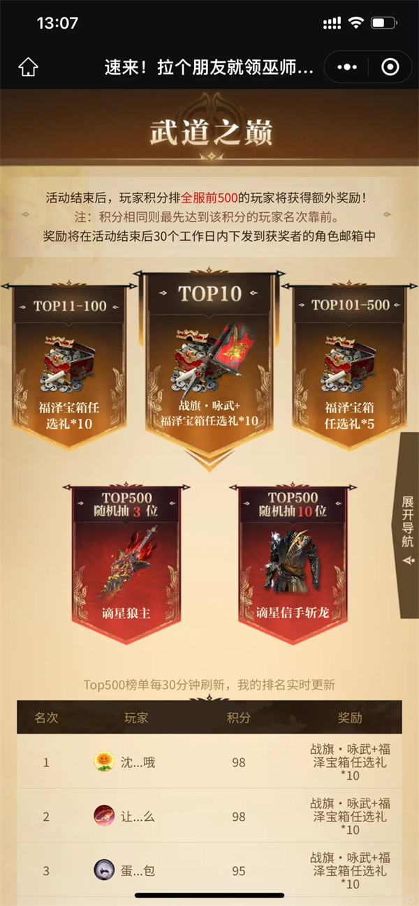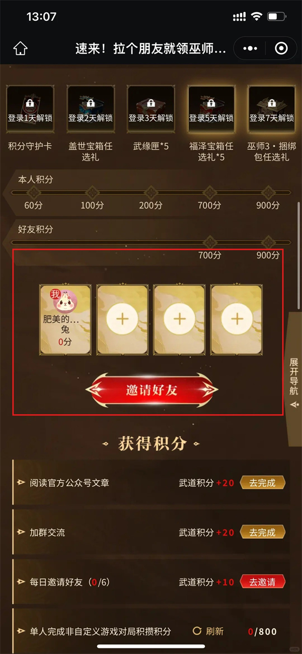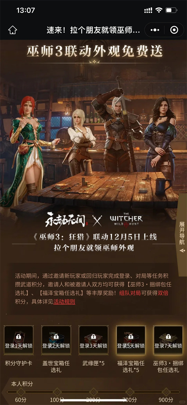达到指定积分后,邀请人和被邀请人均可获得巫师3联动礼包,包含随机礼物如捆绑包、福泽宝箱等。