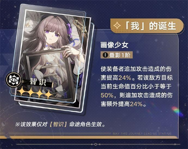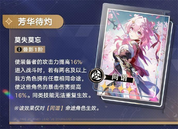 1、提升装备者的攻击力16%,并在战斗开始时,如果队伍中有两名或更多角色拥有相同命途,则使这些角色的暴击伤害提高16%(同类技能无法重复生效)。
