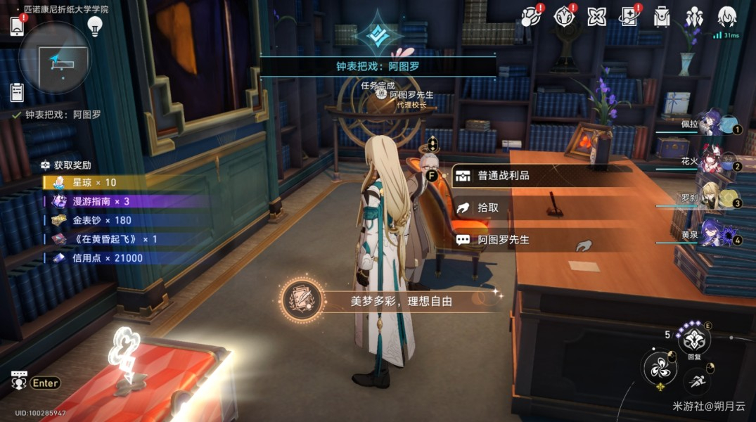 前往校长室,与“阿图罗先生”对话,并使用钟表技巧(需要一个镇静齿轮)。接着与哈里森、查德、尚恩依次对话。回到校长室时会遇到“猫头鹰老师”,完成与他的对话后,获得成就“美梦多彩,理想自由”。