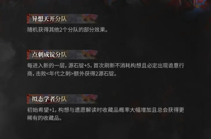 3、拟态学者分队:初始希望值增加,收藏品解读时有更高概率获得稀有物品。
