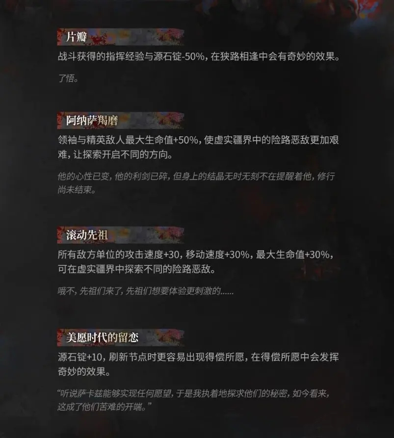 2、阿纳萨羯磨:增加领袖与精英敌人50%的最大生命值,使得战斗难度明显提高,尤其是在虚实疆界的关卡中。
