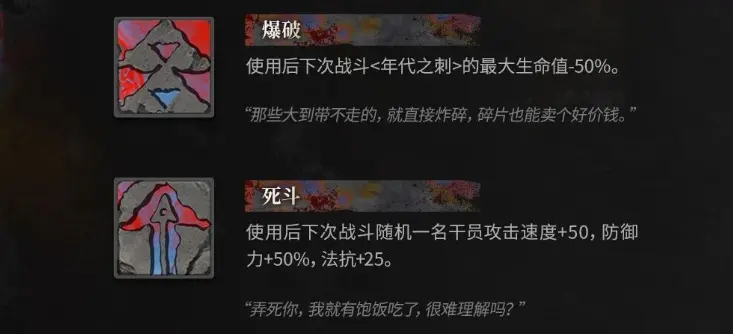 7、死斗:使用后下次战斗随机一名干员攻击速度+50,防御力+50%,法抗+25。