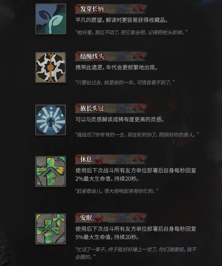 3、族长头冠:帮助解读灵感,解锁更高稀有度的灵感。这些思绪为玩家的战斗和探索提供了更多的策略选择。