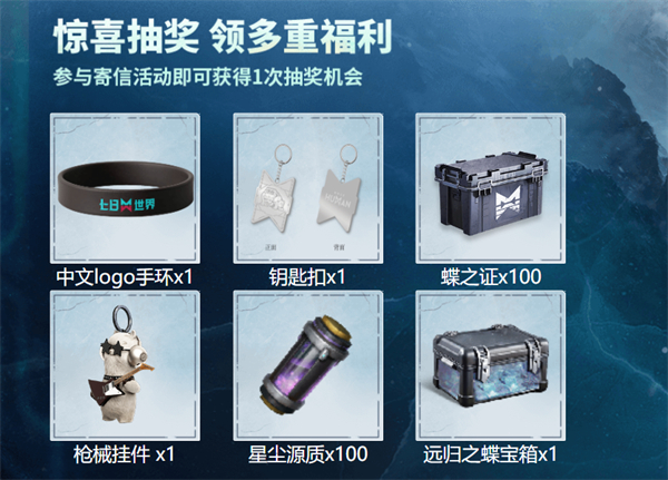 奖品包括限量手环、枪械挂件、钥匙扣以及游戏内的各种稀有道具,如星尘源质、蝶之证和远归之蝶宝箱等。