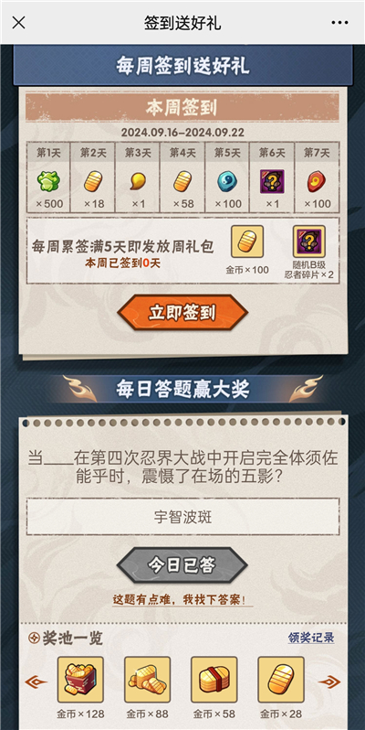 在忍者手游大全">火影忍者手游的微信公众号中每天都会有火影忍者手游相关的每日问答活动,玩家成功答对答案即可领取游戏中的道具奖励。为各位玩家带来《火影忍者手游》今日微信公众号答题分享。今天的题目会是什么样的呢?本文将和大家分享正确答案,让还不清楚的玩家也能受益。赶快来看看吧!那么2024年9月20日今天的题目会是什么样的呢?本文将和大家分享正确答案,让还不清楚的玩家也能受益。赶快来看看吧!