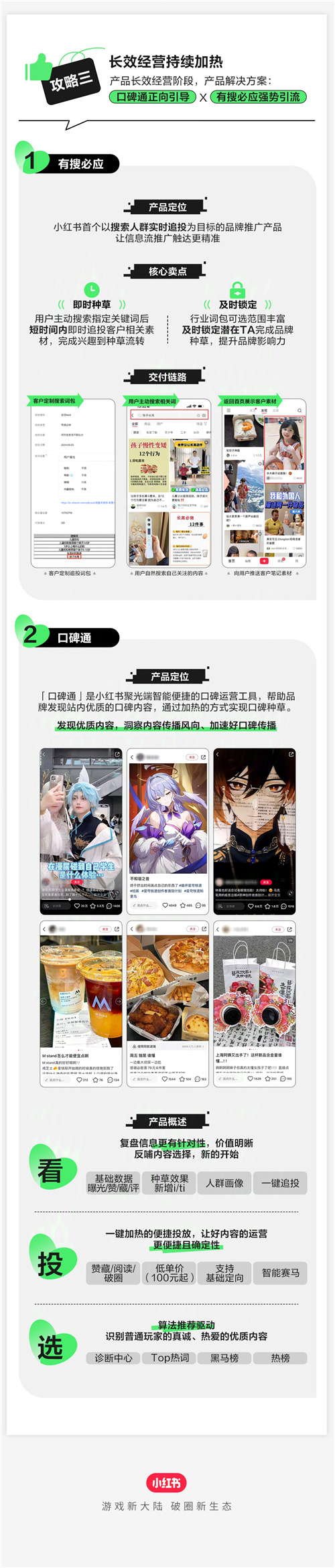 攻略3|长效经 营持续加热:在产品长效经 营阶段,运用【口碑通正引导X有搜必应强势引流】的产品解决方案,实现产品长渗透。其中,有搜必应产品能够让信息流推广触达更精准,让品牌实现即时种草与及时锁定。口碑通作为站内口碑营造新方式,能够帮助品牌通过「看、投、选」发现优质内容、洞察内容传播风向、加速好口碑传播。