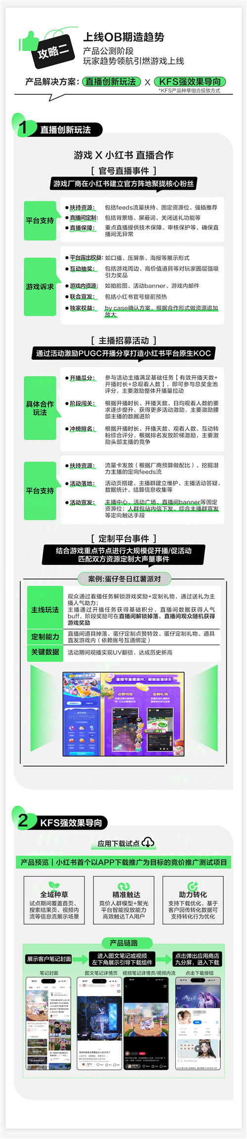 攻略2|上线OB期造趋势:在产品公测阶段,运用【直 播创新玩法x KFS强效果导向】的产品解决方案,借玩家趋势领航引燃游戏上线。以蛋仔冬日红薯派 对案例来看,该游戏通过直 播解锁游戏奖励玩法,随机掉落道具并直发游戏,最终实现活动期间观播UV翻倍达到历史新高。