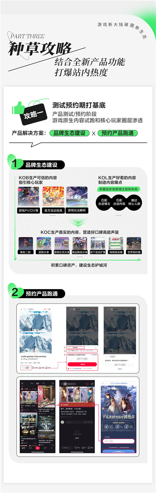 攻略1|测试预约期打基底:在产品测试/预约阶段,采取【品牌生态建设X预约产品跑通】的产品解决方案,推动游戏原生内容试跑实现核心玩家圈层渗透,达成口碑资产积累、建设生态护城河。