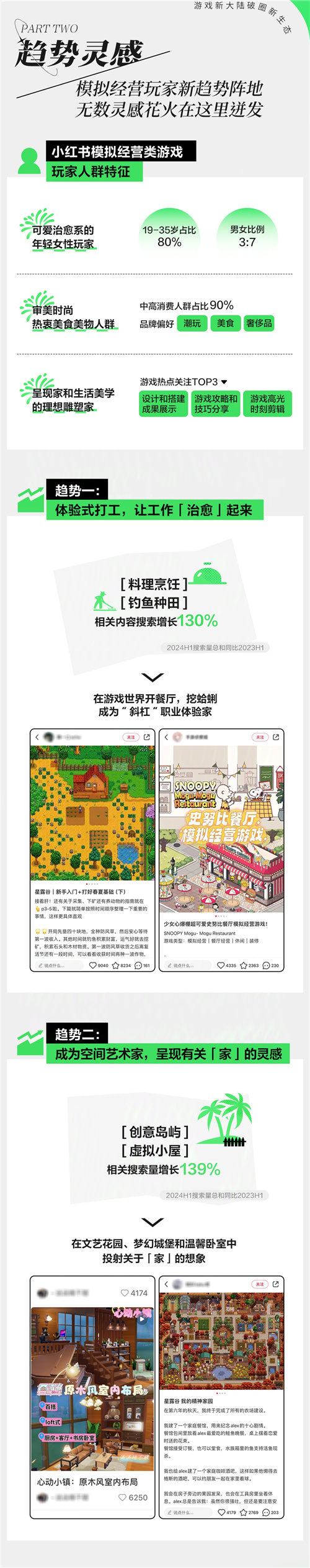 趋势灵感|模 拟经 营玩家趋势新阵地:从小红书模 拟经 营类游戏玩家特征来看,可爱治 愈系的年轻女玩家占比大,TA们审美时尚热衷美 食美物,是呈现家和生活的美学理想雕塑家。玩家们在游戏里的花式操作,也催生出【体验式打工,让工作「治 愈」起来】和【成为空间艺术家,呈现有关「家」的灵感】两大趋势。玩家们在游戏里畅享“斜杠”职 业体验家,在花园城堡和卧室中投射关于家的想象。