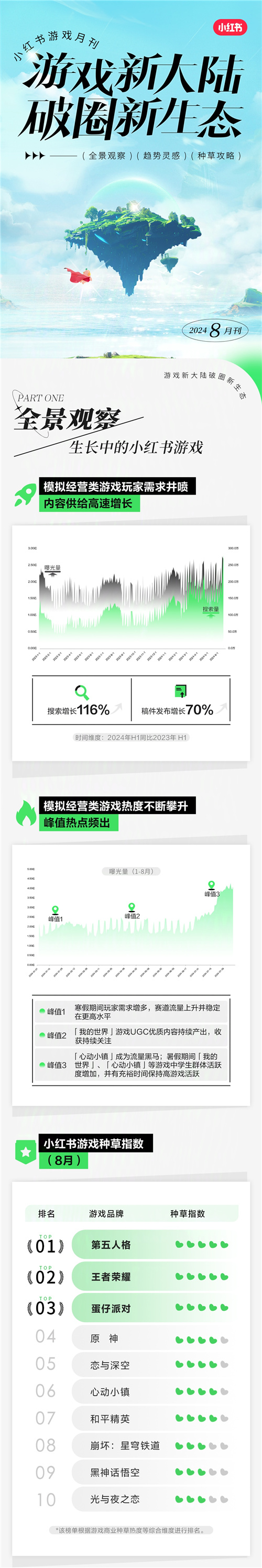 全景观察|生长中的小红书游戏:模 拟经 营类游戏玩家需求井喷,内容供给高速增长。根据小红书数据显示,24年上半年模 拟经 营类游戏搜索同比去年增长116%、稿件发布增长70%。游戏热度的不断攀升推动峰值热点频出,小红书8月游戏种草指数中模 拟经 营类游戏名列前茅。