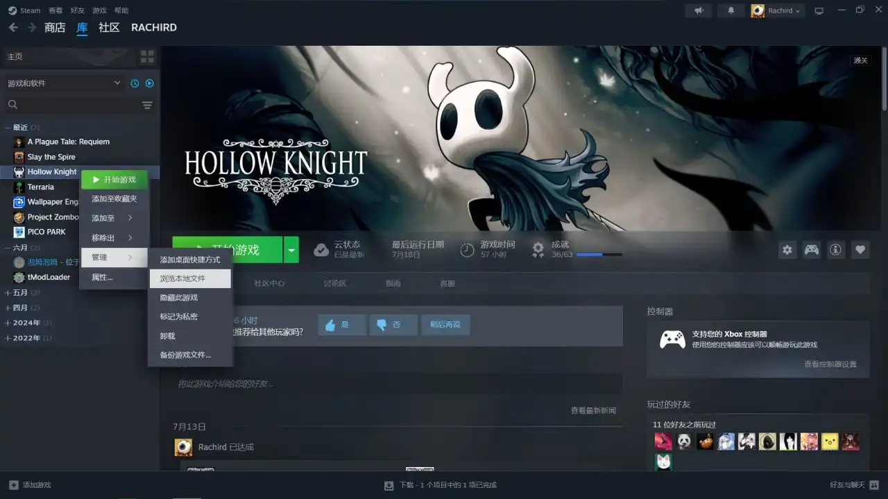 打开Steam,右键点击 空洞骑士 → 管理 → 浏览本地文件;