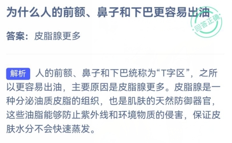 蚂蚁庄园2024年8月20日问题关于为什么人的前额、鼻子和下巴更容易出油,这几个区域被统称为T区,由于这些区域的皮脂腺更多,也会更容易出油。