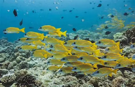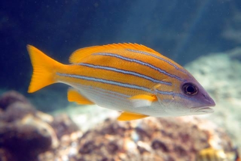 四线笛鲷,又叫四带笛鲷,名字的由来正是因为它的身体上分布着四条非常明显的纵纹。