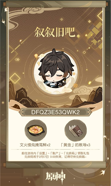 3-兑换码将于2月17日 0:00 失效,记得尽快兑换哦~