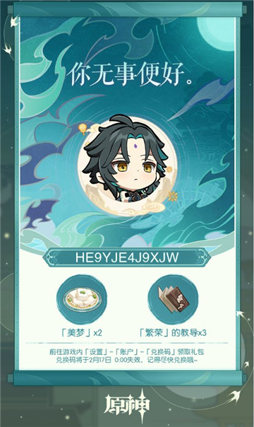 2-旅行者可前往游戏内「设置」-「账户」-「兑换码」领取礼包。使用兑换码后,奖励将会以邮件的形式发送至邮箱,邮件有效期为30天,请及时领取。