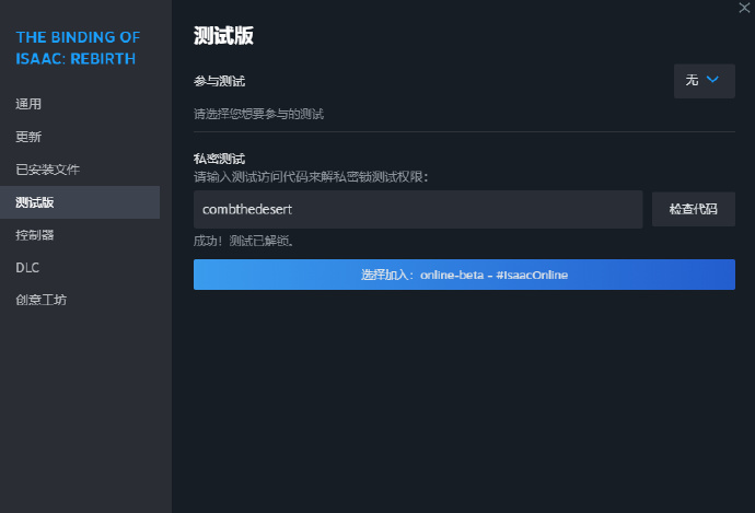 3、选择参与测试“online-beta - #IsaacOnline”即可。游玩需要拥有DLC《以撒的结合:忏悔》,并且停用所有MOD,最多支持4人联机。